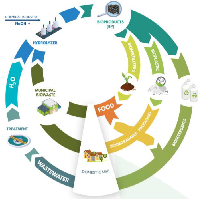 The first objective is to demonstrate the environmental, economic and social benefits of new biobased products (90% soluble biobased products BPs, 10% insoluble residues IR) in the sectors of municipal biowaste management, agriculture, and chemical industry in five EU countries (Italy, Cyprus, Greece, France and Spain), taken as case studies, by: